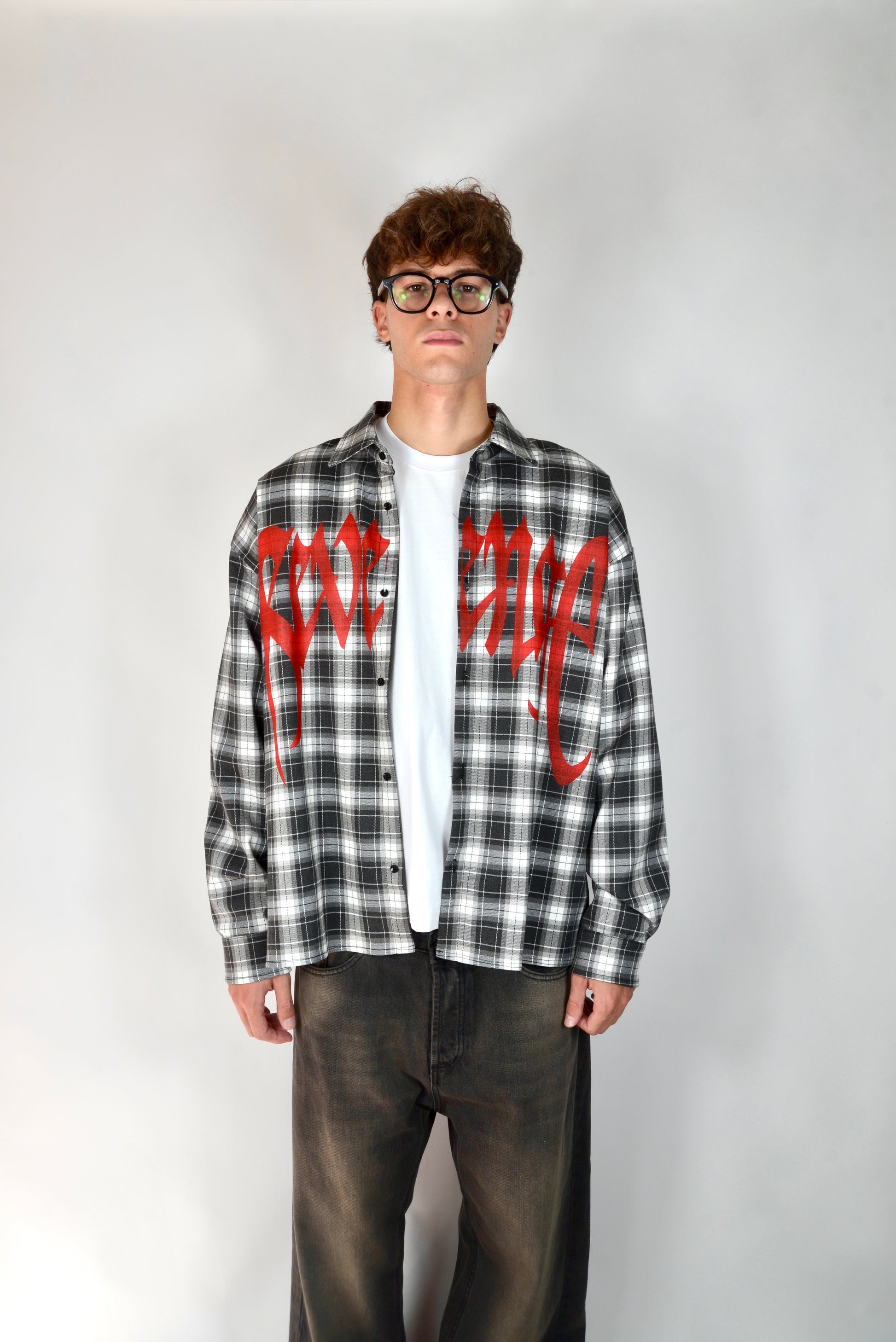 Descrizione: Camicia a quadri con la particolarità della scritta a contrasto sul fronte, Chiusura con abbottonatura e colletto a risvolto