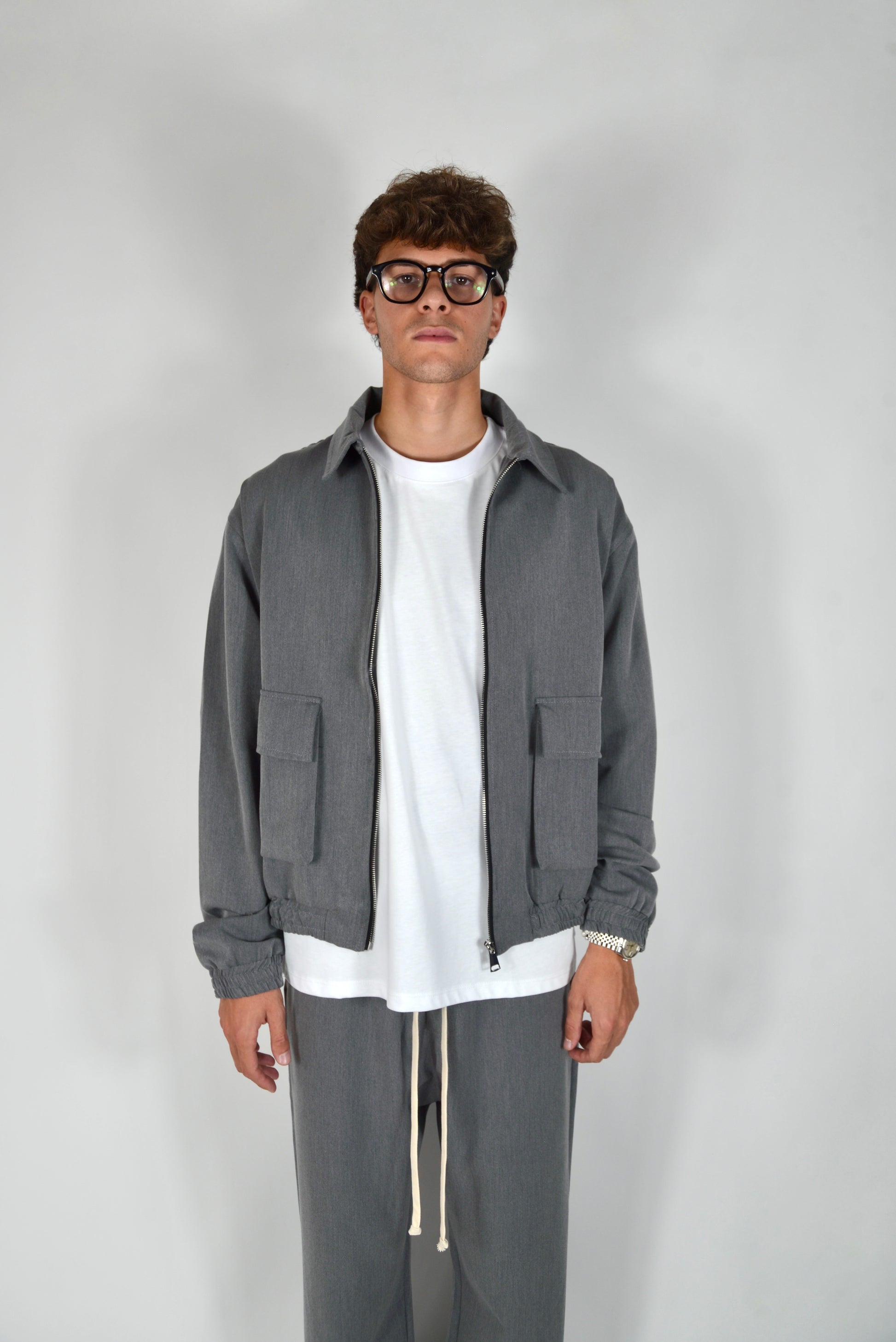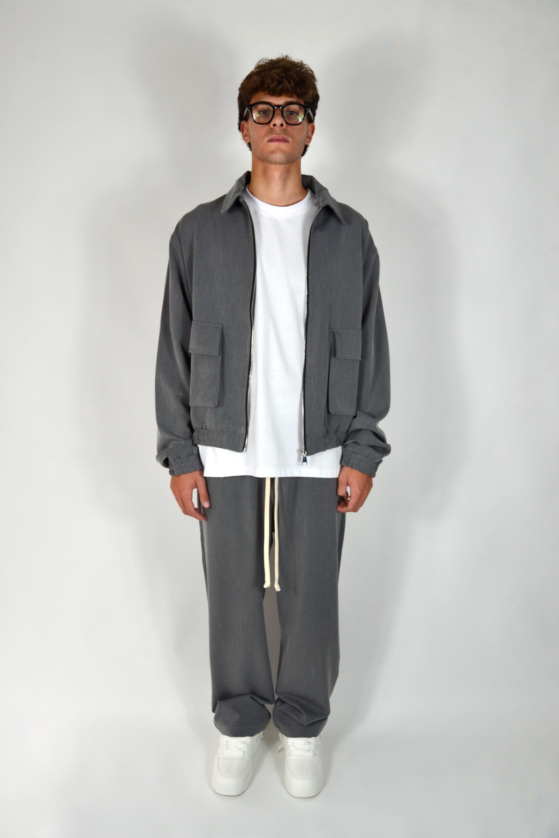 Descrizione: Coordinato composto da giacca con chiusura frontale zip collo reverse e doppia tasca frontale. E pantalaccio a fondo ampio con elastico in vita per regolare la vestibilità